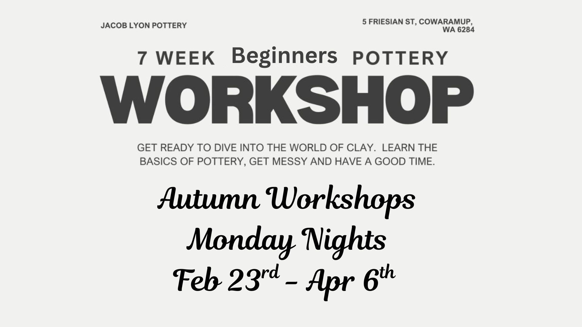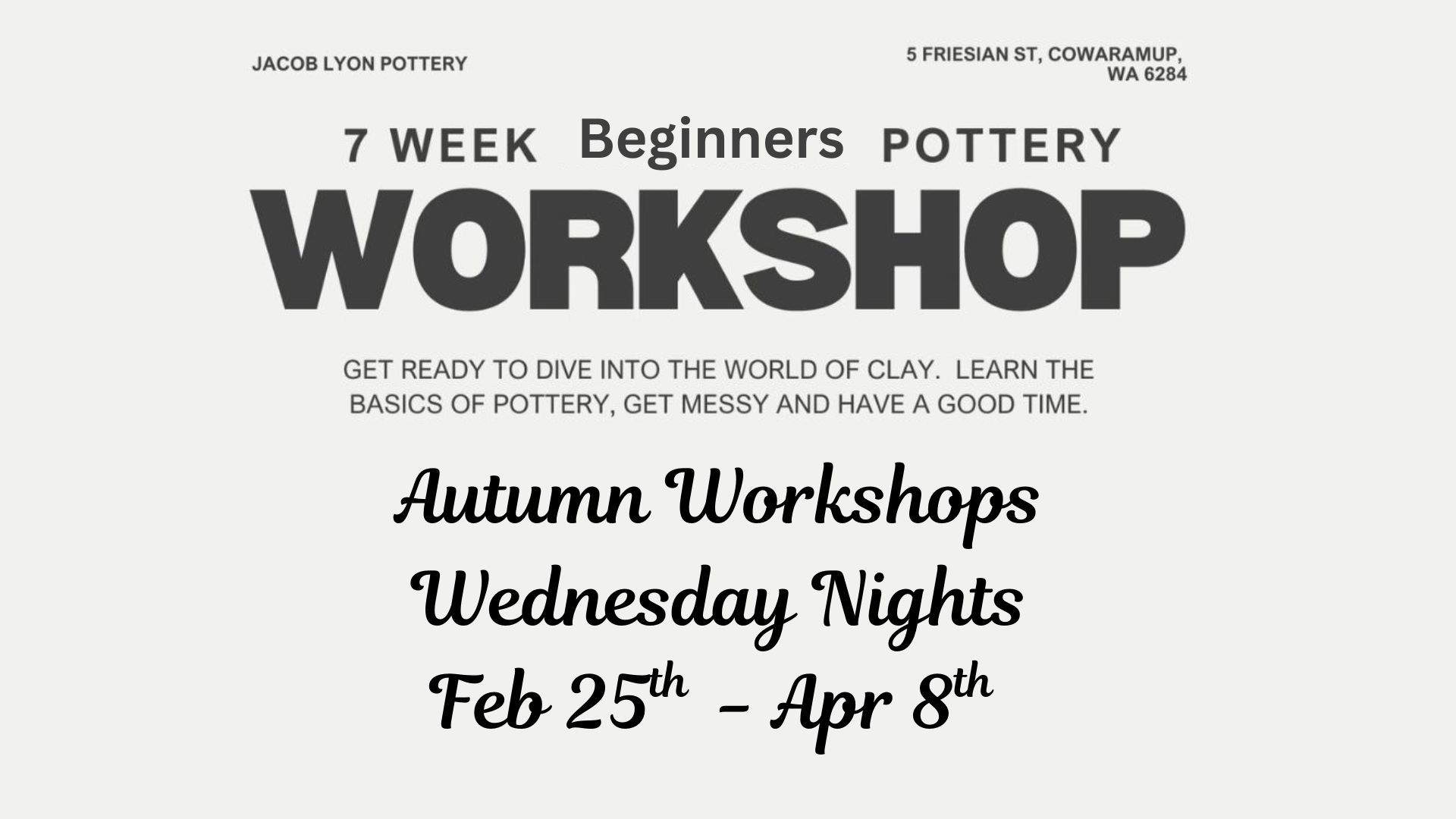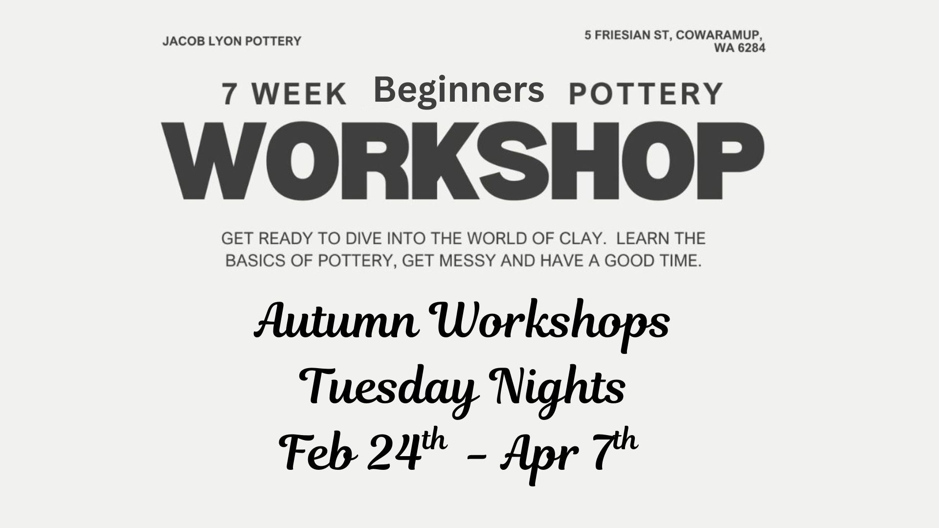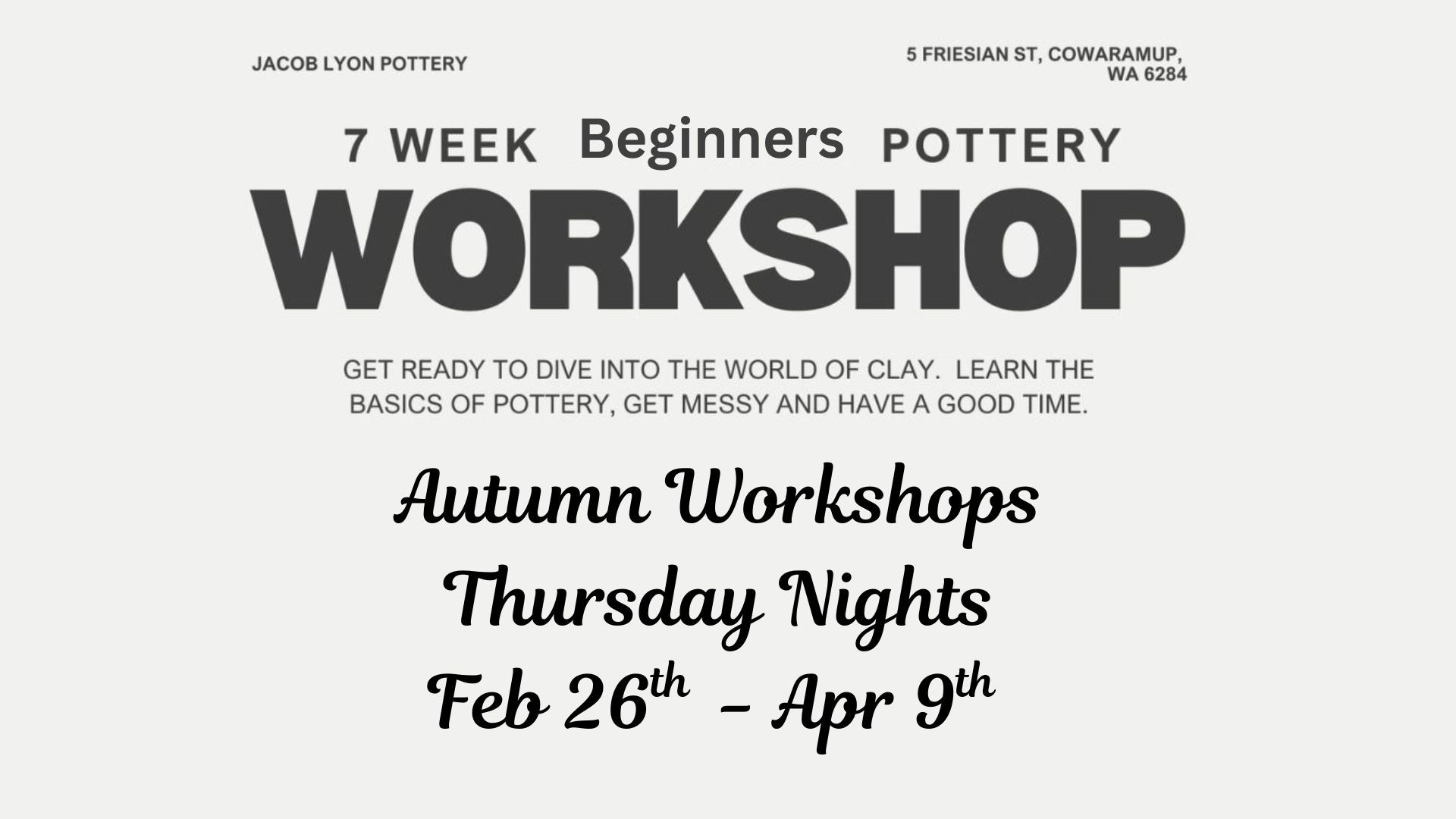 ~ NO clay is provided, however clay can be purchased either from Jacob himself (limited options), from the potters market or Jacksons.